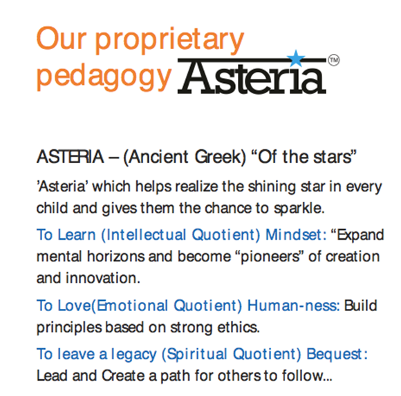 “Asteria” was developed by senior reputed educationists and based on intense research. Both Alphakids International and Bellwether International are driven by it. It is designed to help create successful and responsible global citizens that are able to adapt to a constantly changing world. “Asteria” imparts, nurtures and develops thinking skills engaging the Mind (IQ), Heart (EQ) and Soul (SQ).
